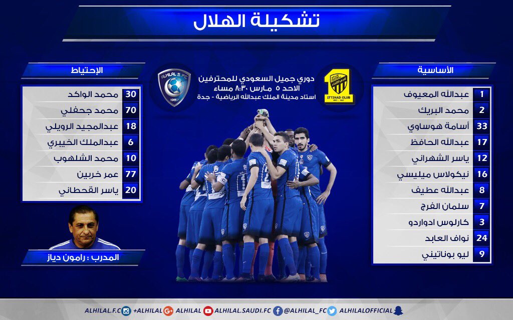 نادي الهلال السعودي Ar Twitter تشكيلة الهلال الأساسية وقائمة الاحتياط في مباراة الاتحاد الجولة العشرون دوري جميل السعودي للمحترفين
