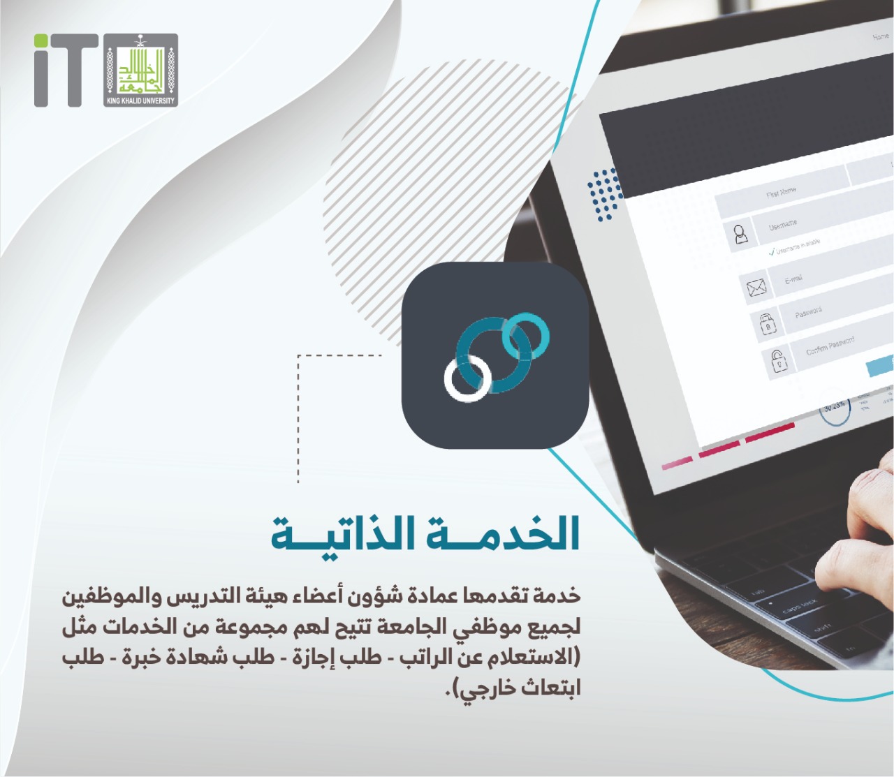 تقنية المعلومات Twitterren الخدمة الذاتية هي خدمة تقدمها عمادة شؤون أعضاء هيئة التدريس والموظفين لجميع موظفي جامعة الملك خالد تتيح لهم مجموعة من الخدمات مثل الاستعلام عن الراتب طلب إجازة طلب شهادة